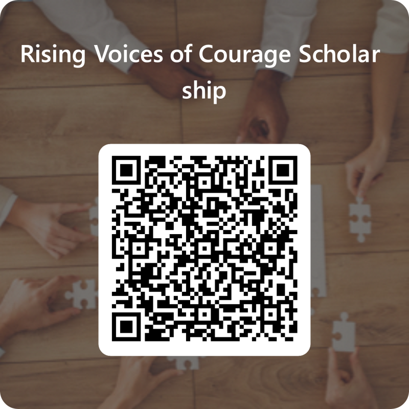 Taking the next step towards your future is simple. To apply for The Rising Voices of Courage Scholarship, please click on the link below or scan the QR code.